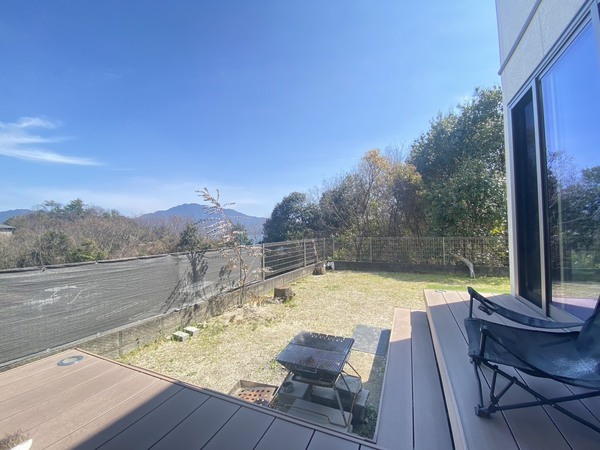 〇アウトドアリビング、広々とした庭とデッキ