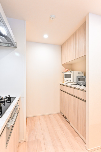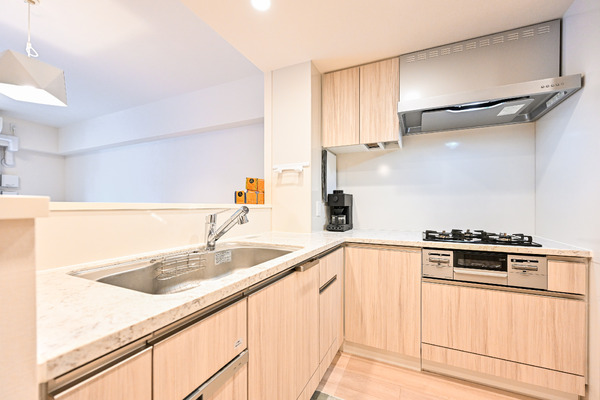■作業スペースを広く確保できるL字型キッチンにはディスポーザーや食洗器、造り付食器棚が備わっております。
