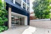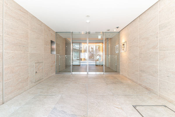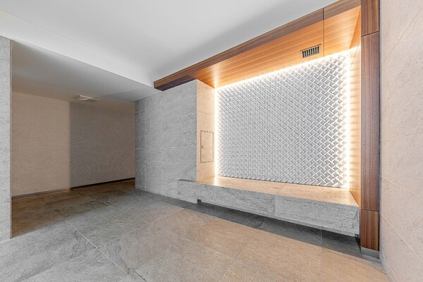 ◆早大通りから一本奥へと歩みを進めた先に、木調の縦ルーバーを設けたアプローチ空間が出迎えてくれるメインエントランス。