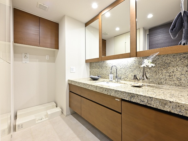 ・洗面所:天然石カウンター、ドイツ・グローエ社製水栓