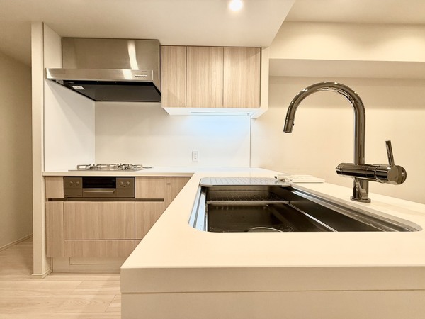 □対面式システムキッチンには食洗機・浄水器一体型水栓が備わっております