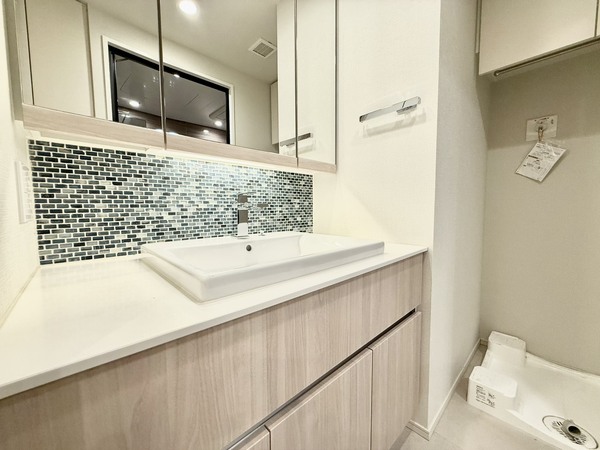 □洗面化粧台は三面鏡タイプのミラーキャビネット付