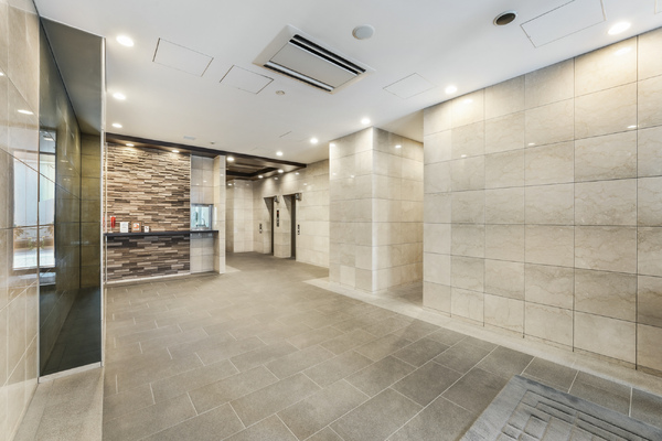 その外観はスマートで都会的なフォルムでありますが、エントランスホールは天然石による柔らかな意匠が施されており、居住者を優しく迎え入れます。
