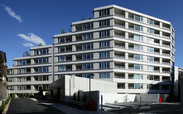 ■4700m2以上の広大な敷地を活かした設計、建物を少し起伏があり、川の流れもある表情豊かな周辺の地形の一部とすることで、街並みとの調和を図る「ランドスケープレジデンス」