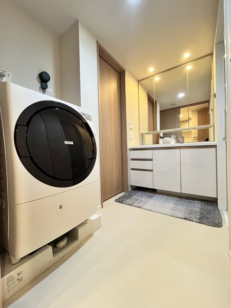 ボウル一体型洗面化粧台、三面鏡裏収納、ヘルスメーター収納、リネン庫、