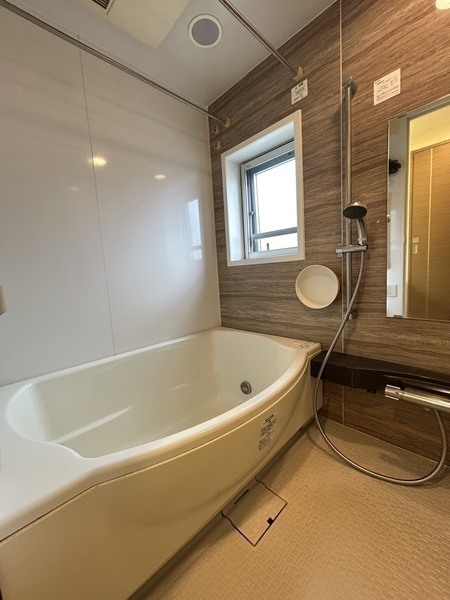 浴室は、ご家族でゆったり入れる、ベンチ付きのシェル型ワイド浴槽で、