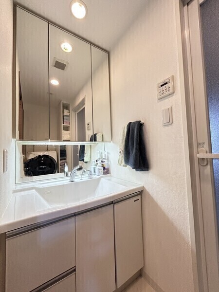 カウンター一体型洗面ボウル、三面鏡裏収納、リネン庫、