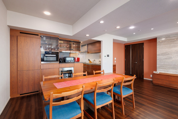 約25.7帖のLDKには、ミーレ社製電子オーブン、ワインセラー内蔵の収納、