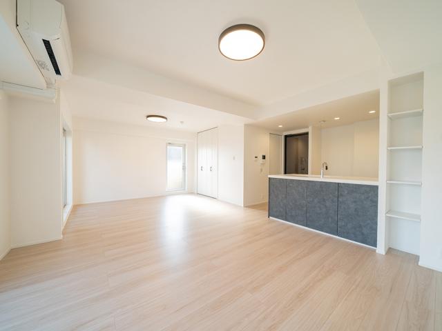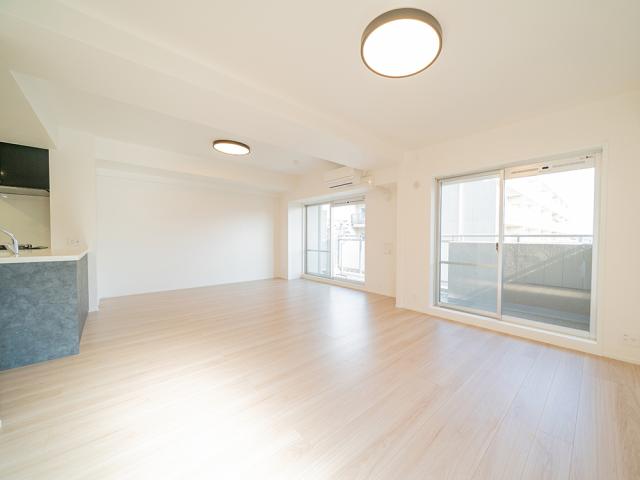 ・LDK約19.4帖!2面バルコニーに面しています。 ・2025年12月内装リフォーム内容 ・間取り変更:3LDK→2LDK ・新調:キッチン、ユニットバス、洗面化粧台、トイレ、建具 ・張替:クロス、フローリング(全室)、CF ・その他:ハウスクリーニング